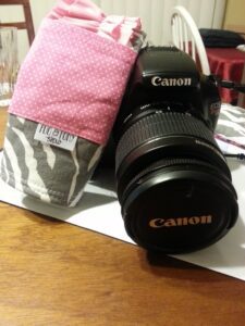 The strap cover is a perfect fit for my Canon! The lens cap is easy to get in/out of the pocket, and there's also a second pocket on the other side. The cover is also padded, so it's a very comfortable wear. Cute & affordable! I'm already thinking about purchasing another...maybe one with a monogram next time...